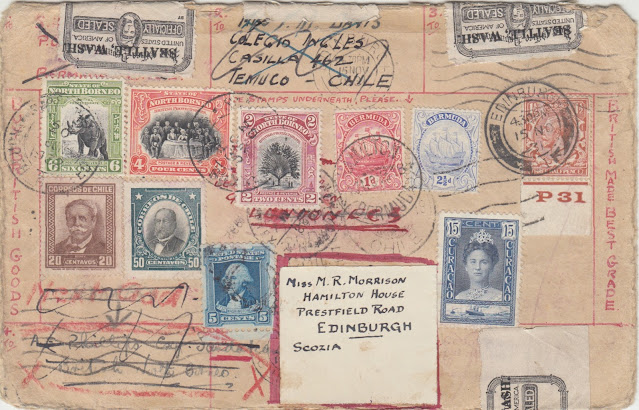 It is certainly an attractive and interestingly looking cover. Here we can see stamps from North Borneo, Bermuda, GB, Curacao, Chile and USA. The 12c in NB stamps would be the prevailing surface rate to GB in 1932. Curacao is an island country at the northern end of S America which was part of the Netherlands. This cover started its journey in Edinburgh Scotland on 15 NO 31. The postmark on the NB stamps was from Sandakan dated 20 JUN 1932. The other postmarks seen are from Bermuda, Chile and USA. It was eventually addressed back to Edinburgh.